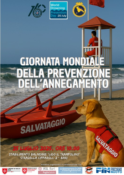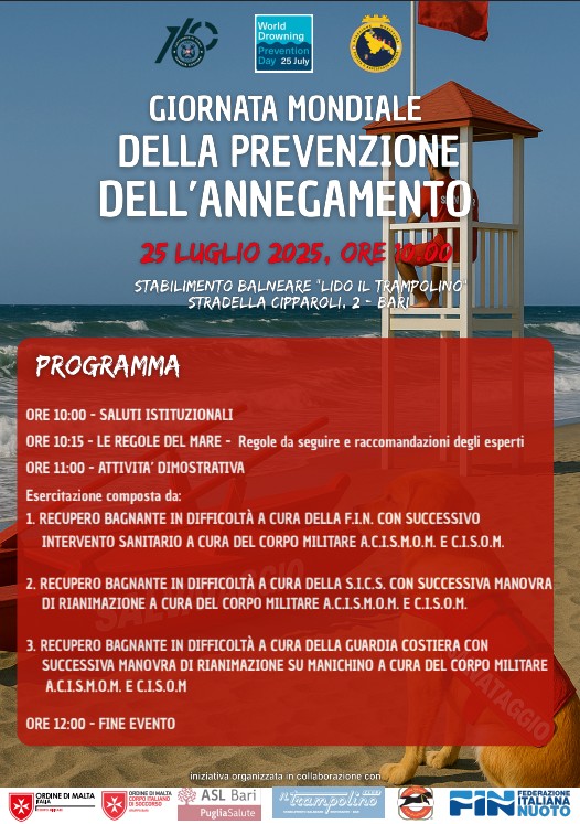 In occasione della Giornata Mondiale della Prevenzione dell’Annegamento (World Drowning Prevention Day) si terrà, il 25 luglio alle ore 10:00 presso lo stabilimento balneare “Lido il Trampolino” di Bari, una speciale manifestazione interamente dedicata alla sensibilizzazione ed all’educazione sulla sicurezza in mare.