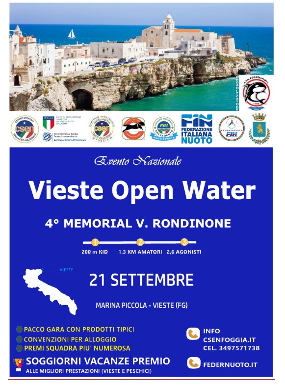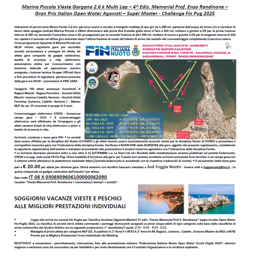 La gara è valida per il circuito nazionale Gran Prix Italian Open Water Agonisti – Super Master – Challenge Fin Pug 2025 ed avrà come scenario Marina Piccola Vieste Gargano per un circuito di 2.6 k Multi Lap.